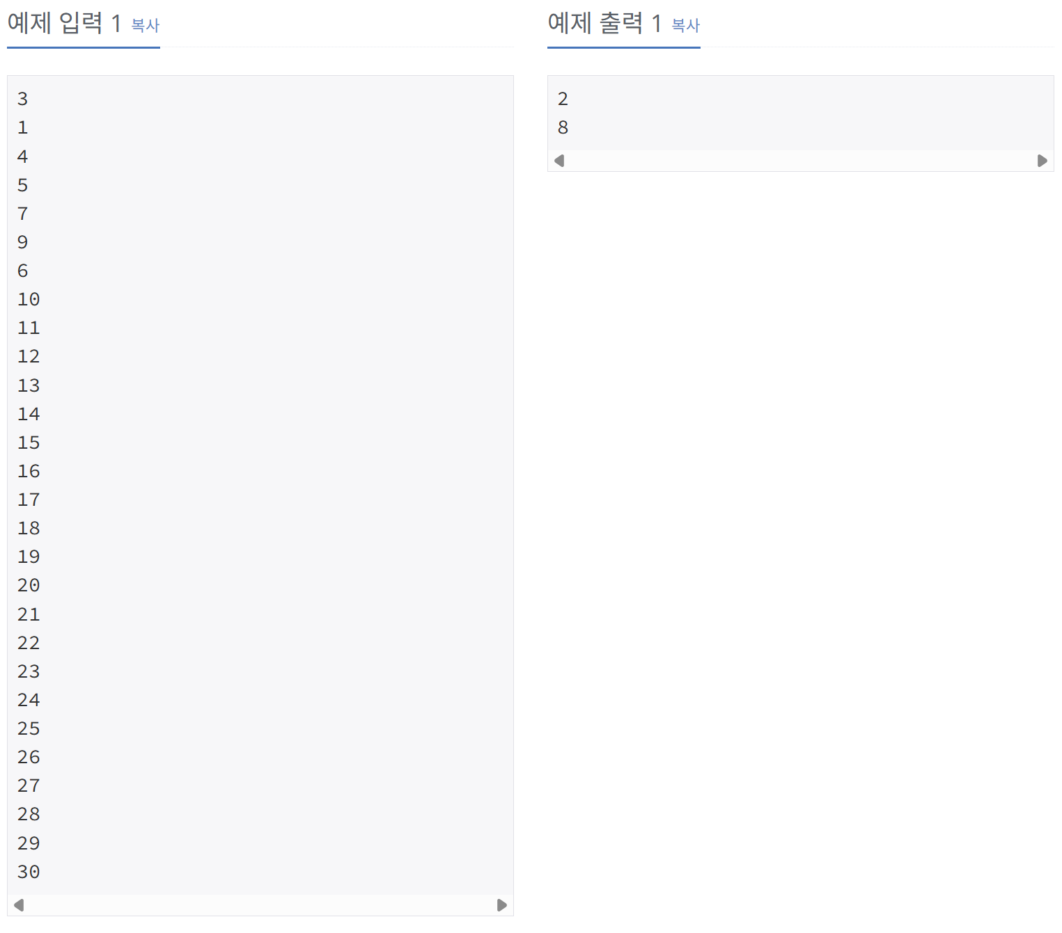 출력은 2줄이다. 1번째 줄엔 제출하지 않은 학생의 출석번호 중 가장 작은 것을 출력하고, 2번째 줄에선 그 다음 출석번호를 출력한다.
