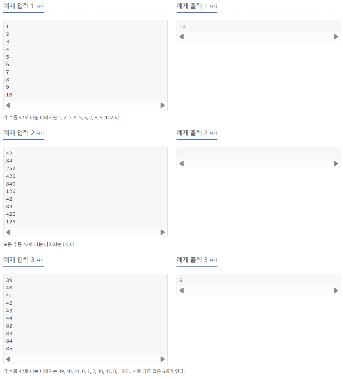 첫째 줄에, 42로 나누었을 때, 서로 다른 나머지가 몇 개 있는지 출력한다.