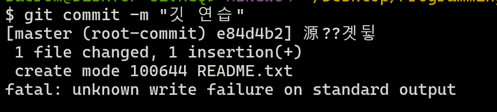 텍스트파일 작성해서 커밋 하는데 사진과 같이 글자가 깨지면서 fatal: unknown write failure on standard output이 떴다.