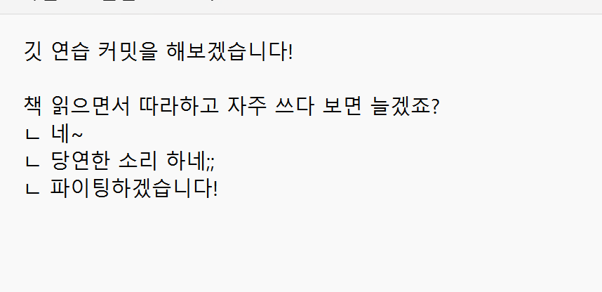 이때 1 file changed, 1 insertion(+), 1 delection(-) 메세지가 보이면 성공