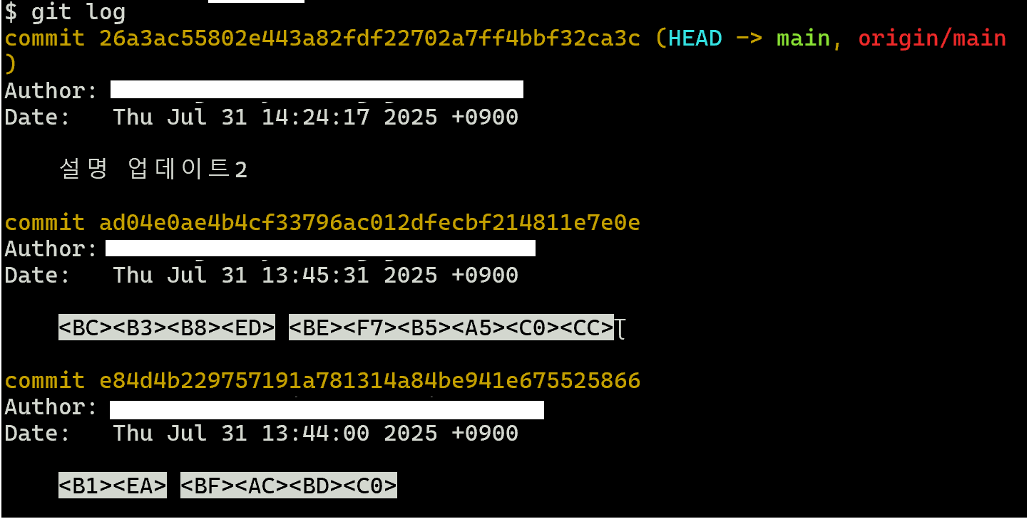 | [git] 출력 오류_한글 깨짐 현상 fatal: unknown write failure on standard output (0) | 2025.07.31 |