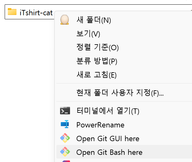iTshirt-cat과 같은 경로에 iTshirt-dog라는 새로운 폴더를 만들어주고 이 폴더에서 마우스 우측 버튼 클릭해 Git Bash Here 클릭
